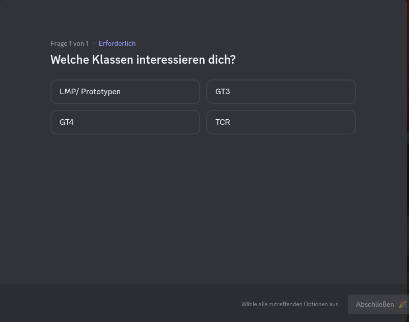 Wähle mindestens eine Klasse aus, in der du fahren möchtest. Oder einfach alle.