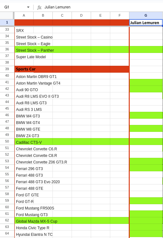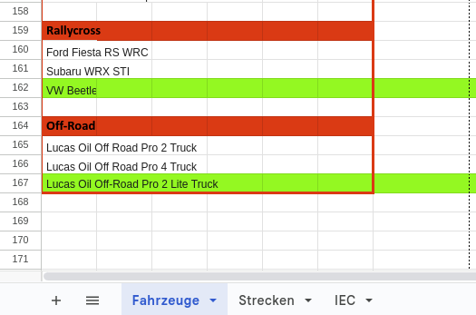 Felder, die von Anfang an Grün sind, sind Free-Content, die jeder besitzt! - n der Fußzeile der Tabelle findet ihr weitere Tabs für die Strecken. Dort gilt das Gleiche vorgehen wie unter dem Fahrzeuge Tab.