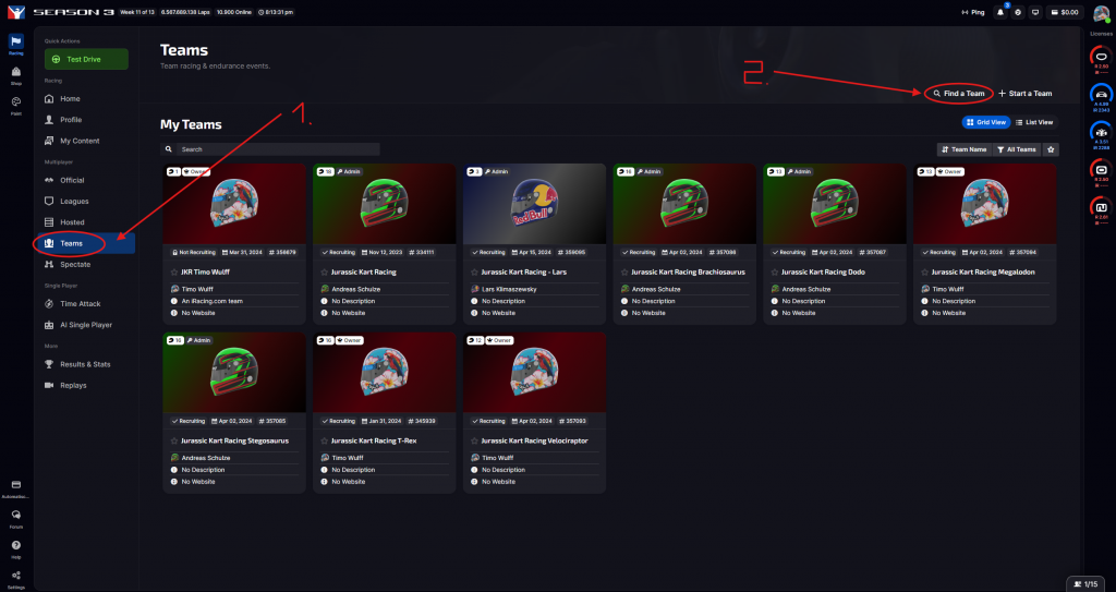 - In der iRacing UI dann nach den ID’s suchen und bei JEDEM Team bewerben!